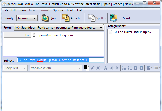 3) You should now have a new message ready to be forwarded with your spam attached. You can drag additional messages from your inbox to the attachment area to send multiple messages at once.